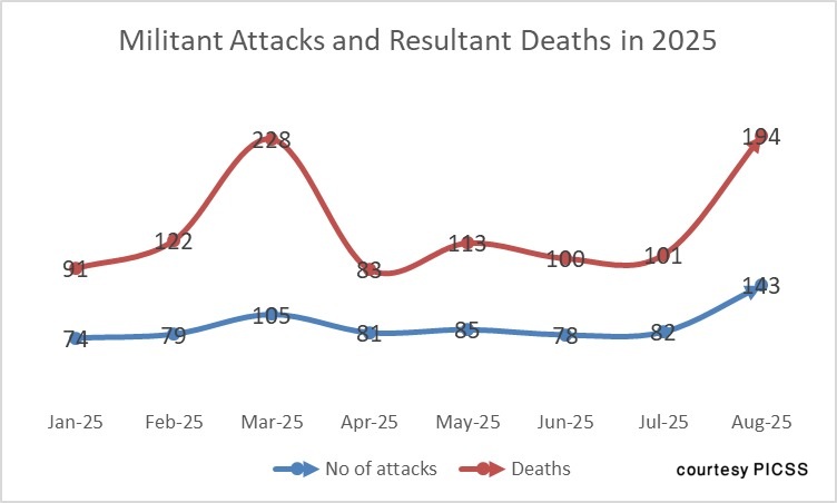 پاکستان کې د شخړو او امنیتي څېړنو انسټیټیوټ (پيکس) د رپورټ ترمخه، د جولای د میاشتې په مقابله کې په اګست کې وسله وال بريدونه 74 فيصده سېوا شوي دي. په رپورټ کې ویل شوي، د اګست په میاشت کې 143 وسله وال بريدونه شوي او په دغې حساب د اګست میاشت په تېرو لسو کلونو تر ټولو خونړۍ مياشت وه، تېره میاشت شوي وسله وال بريدونه د 2014م کال د فرورۍ نه پس تر ټولو زيات بریدونه ریکارډ شوي دي.