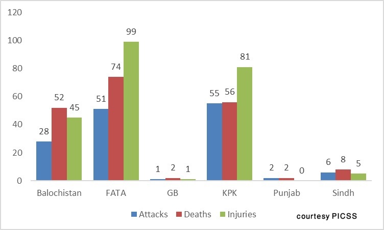 تر ټولو زیات بریدونه په خیبر پښتونخوا کې شوي، په ځانګړې توګه قبايلي (پخوانۍ فاټا) کې 51 وسله وال بریدونه شوي دي، په دغو بریدونو کې 74 کسان وژل شوي، چې پکې 20 امنیتي سرتېري، 12 ملکي وګړي او د امن کمېټۍ يو غړی شامل دی. ويل شوي، په امنیتي عملیاتو کې 24 وسلهوال وژل شوي دي. وسله والو بريدونو کې 99 کسان ټپيان شوي، 50 پکې د امنيتي ځواکونو غړي او 41 ملکي وګړي شامل دي.