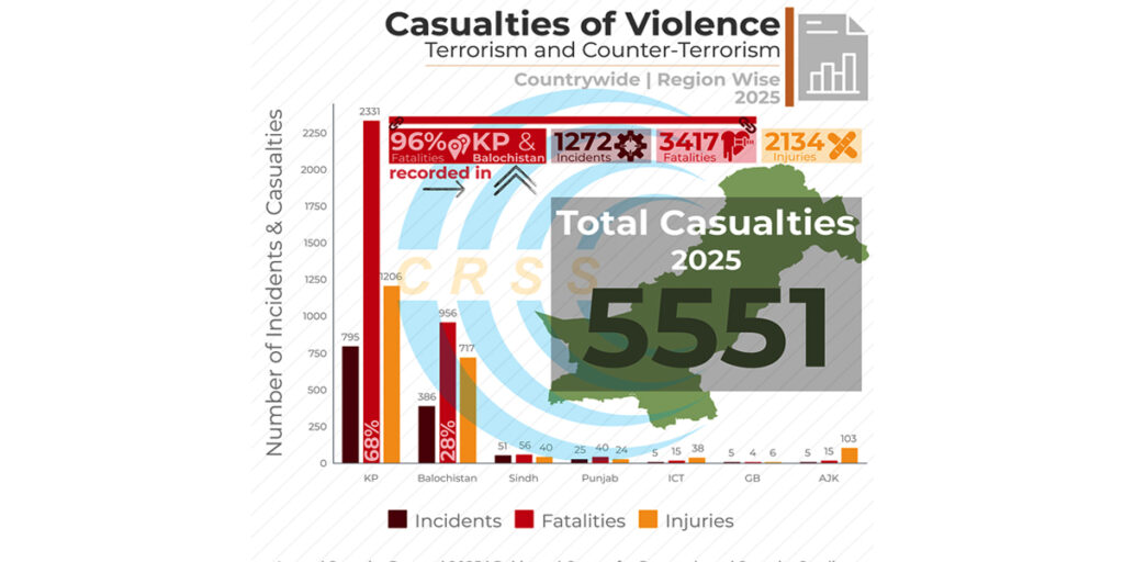 په ټوله کې، ۲۰۲۵ د یوې لسیزې په موده کې د پاکستان لپاره تر ټولو خونړی کال ګرځېدلی، چې پکې د ترهګرۍ او ناامنۍ په پېښو کې ۳،۴۱۷ وژنې شوي دي، کوم چې د ۲۰۱۵ راهیسې تر ټولو لوړه شمېره ګرځېدلې ده.